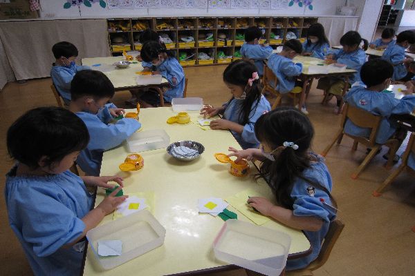 折り紙を折り、クレパスで線を描き