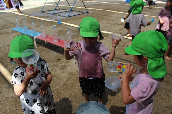 自分で作ったペットボトルシャワーを使って遊んだり