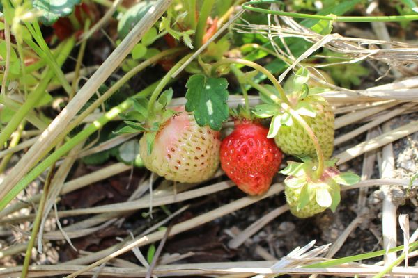 まだ、いろがついていないいちごも、おひさまのひかりをあびて、あかいいちごにいろづくことでしょう。たくさんとれたら、いちごじゃむができるかな?
