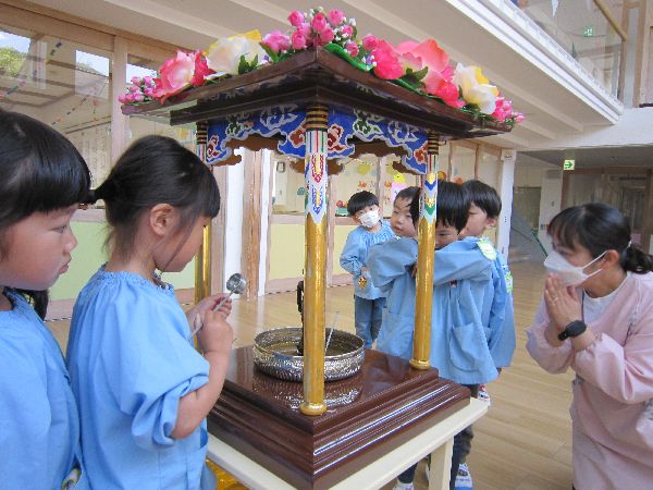 その後は一人ずつ甘茶をかけてお祝いしました。