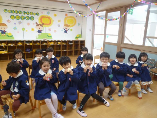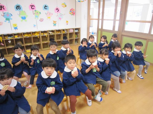 今日と明日はおやつを食べて11時降園です。みんなでおいしくおやつを食べました。