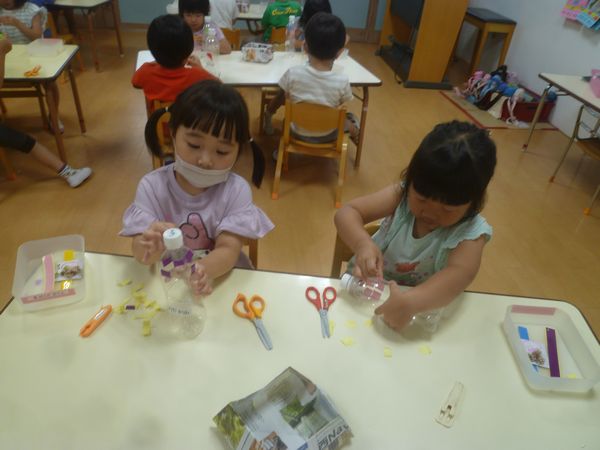おうちから持ってきたペットボトルに好きな色三色のビニールテープを選んではさみで切って貼り付けました!