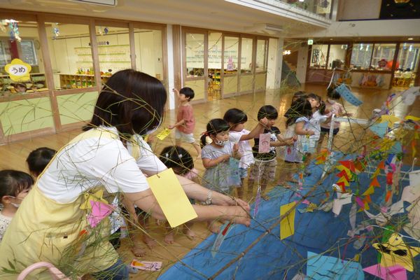 そして、幼稚園に大きな笹が届いたので、みんなで作った七夕飾りを笹に付けました!
