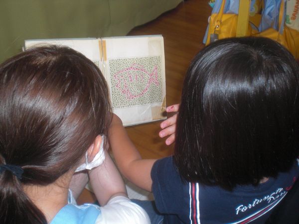 『指がどっちに向いているかを見てそれと同じ方向を指さしてね』という方法で視力検査をしました。 また、色覚検査もしました。