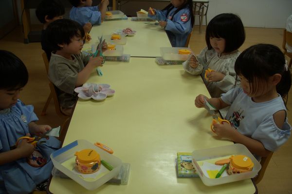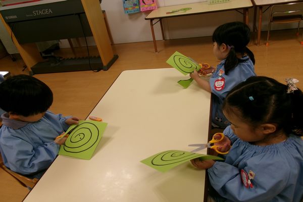 ハサミを使ってぐるぐるへびを切りました。曲線も紙を持つ手を動かしながら、上手に切ることができたね!