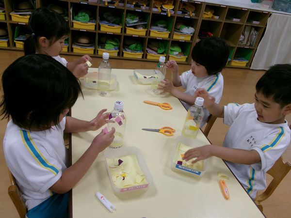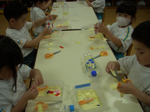 プールで遊べるペットボトルシャワーを製作しました。ビニールテープを切って四角にしたり、さらに切って三角を作ったりして飾り付けをしました!
