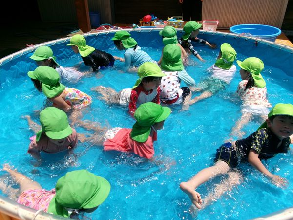 良く晴れた日にプール遊びをして、自分の作ったペットボトルシャワーを楽しみました。待ちに待ったプール遊びはとても楽しそうでした♡