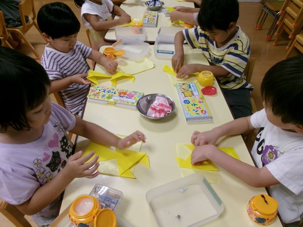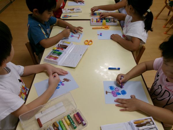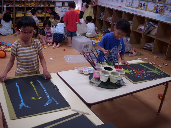 絵の具あそびでは花火を描きました!みんな夏休みに見たよね!「ひゅ~バーン‼」と大きく筆を動かしたり、スタンプをしたりしました!