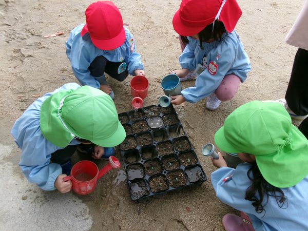 そらまめの種を植えました!お当番さんが毎日水やりをしてみんなで育てていきます!みんなが年長組さんになったら収穫しようね!