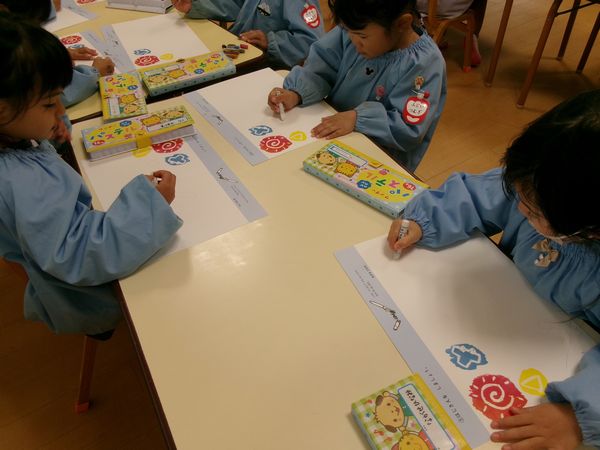 水彩あそびでははじき絵を楽しみました!白いクレパスで描いた絵が絵具を塗ると浮き出てくる様子に「すごーい!」とワクワクしていました!