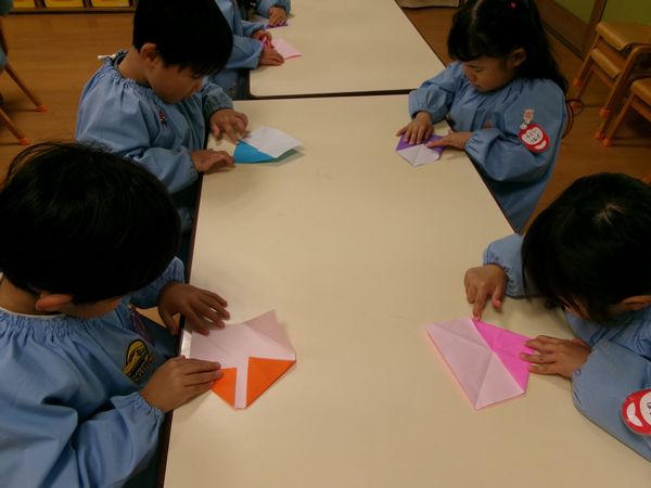 こまを作りました。折り紙の折り線を付けながら、端と端をそろえて丁寧に製作しました。じょうずに回すことができたね!
