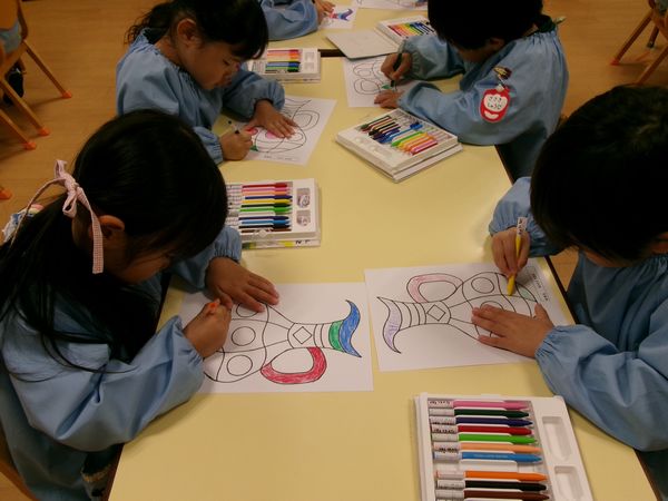 かびんの色塗りをしました。同じ色が隣り合わないように色を変えながら上手に塗ることができました。