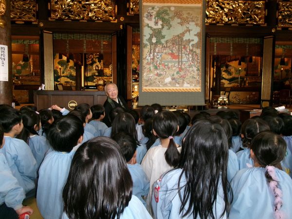 お寺に上がってお話を聞いたり、近くで涅槃図を見せてもらいました。