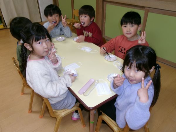 歌を歌ったり、カルピスをいただきながらお祝いすることが出来ました。今週から自園給食も始まり美味しくいただいています。ひなまつりの日は「ちらしずし」がでました☆彡