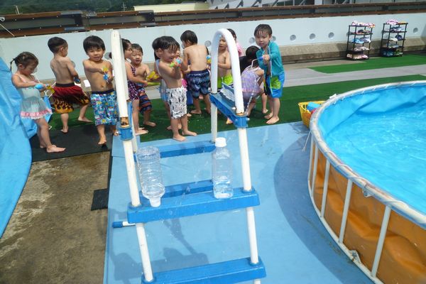 今年は雨がたくさん降って、たくさんの回数プールで遊ぶことが出来ませんでした。それでもプールサイドで水遊びをして遊びました。