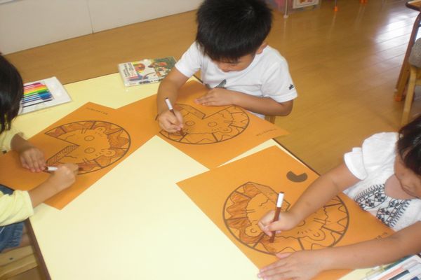 今日は、『らいおんかざぐるま』を作りました。たてがみの色を塗るときは、しっかりと手を固定して塗りました。1学期に比べると筆圧も強くなってきました★