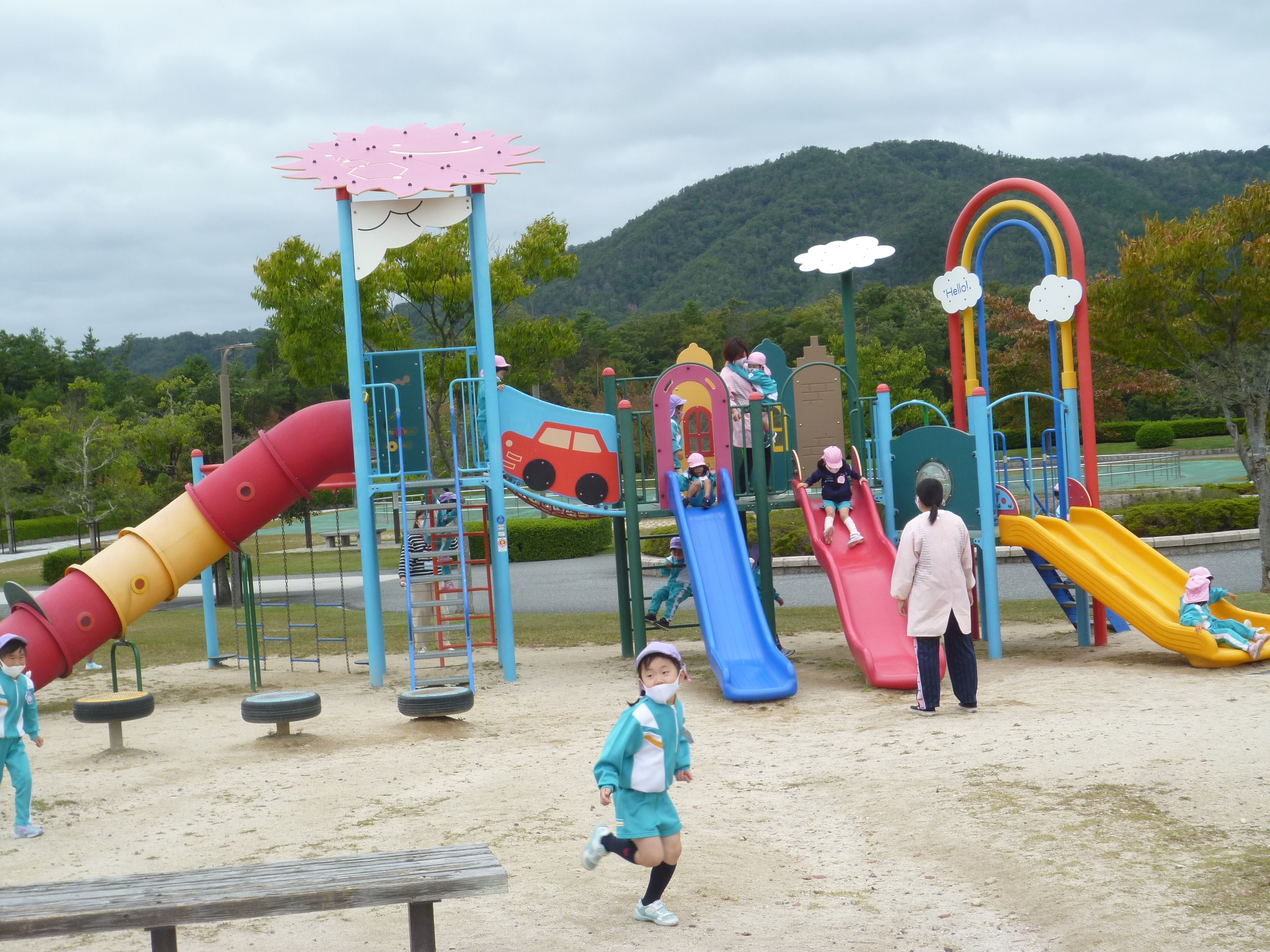 幼稚園にはない滑り台や少し高めのブランコ、ネットのトンネルなど、ワクワクする遊具で遊びました。広い場所で、たくさんのお友だちと鬼ごっこも楽しみました。