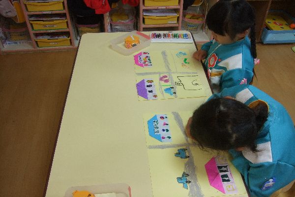 今日は、折り紙で作ったおうちとお店を貼って、みんなのまちを作りました。