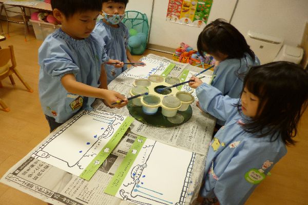 今日はえのぐ遊びをしました! えのぐを垂らし、画用紙を斜めにすると、、、