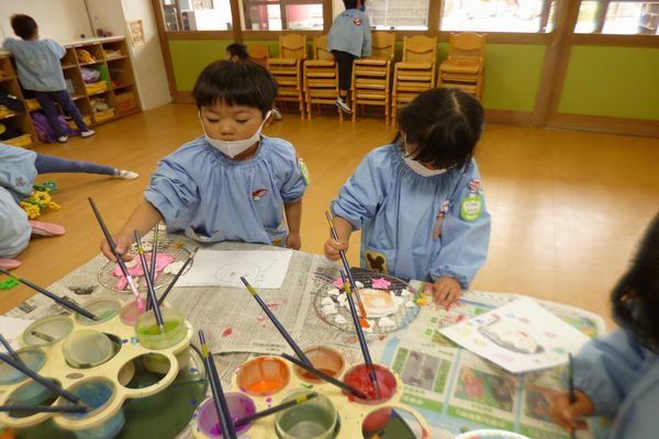 作品展に向けて、紙粘土に絵の具で色を塗り始めました! 一気に塗ると、色が混ざってしまうので、少しずつ塗り進めています! 完成が待ち遠しいようで、「早く全部の色塗りたいなあ」と呟いていました★