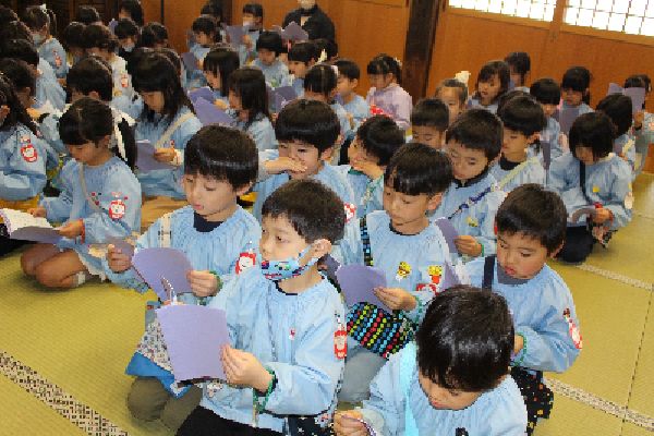 園長先生からお話を聞き、幼稚園に帰って、きなこもちをいただきました。