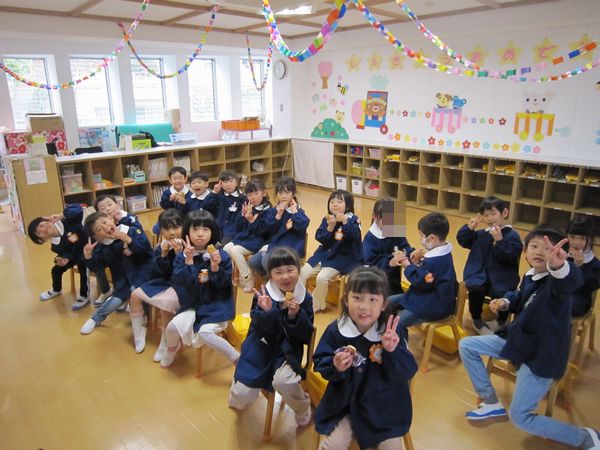 ほし1組、ほし2組それぞれのクラスで先生のお話を聞いて、みんなでおやつを食べました♪