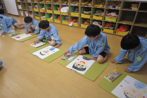 お父さんの絵を描いて、周りをえのぐで塗りました!
