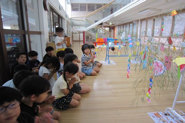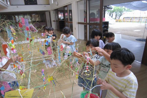 園用の七夕飾りを作り、大きな笹の葉に飾りました!