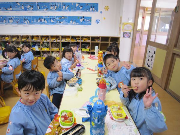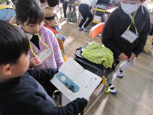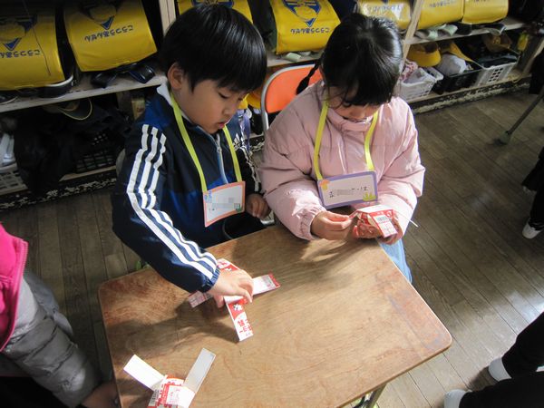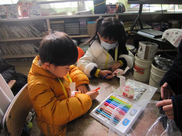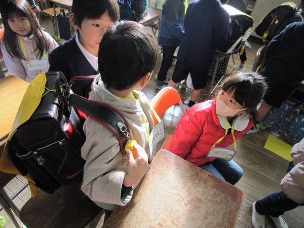 1年生の教室に入らせてもらい、ランドセルを背負わせてもらったり、教科書を見せてもらったり、牛乳パックでつくったこまをプレゼントしてもらい色を付けて遊びました☆彡