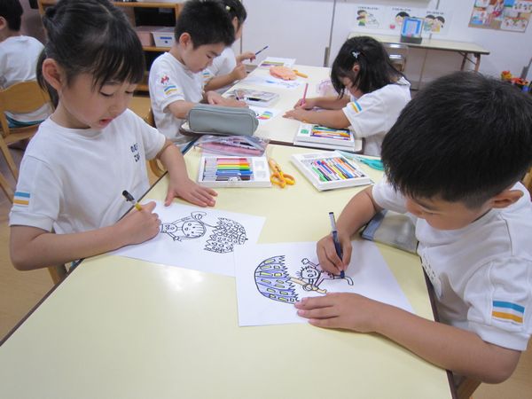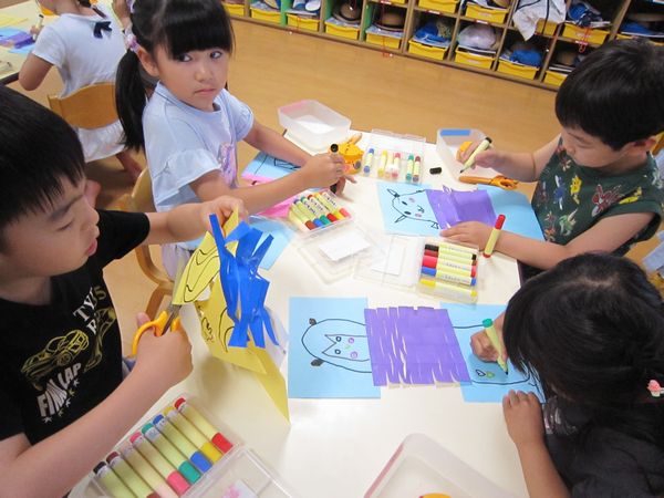 スケッチペンで描いた後、クーピーで色を塗り、はさみで切り抜いたら完成です♪いろんな素敵な模様の傘ができました☆