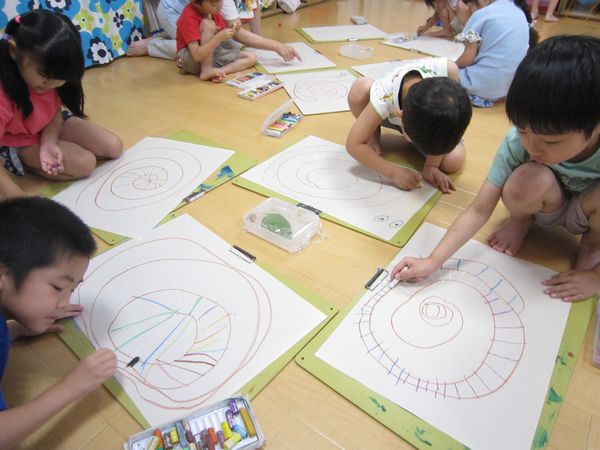 かたつむりを観察しながら、クレパスと絵の具で絵にかいてみました!