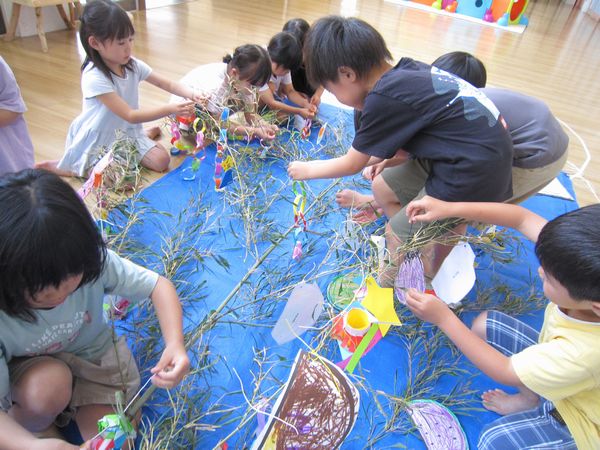 幼稚園の大きな笹の葉に七夕製作したものを飾り付けました!