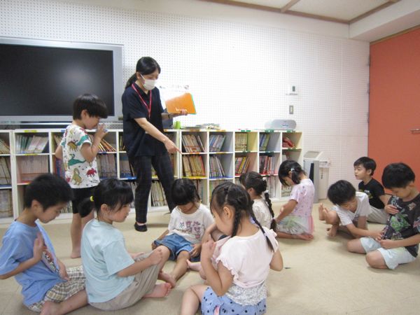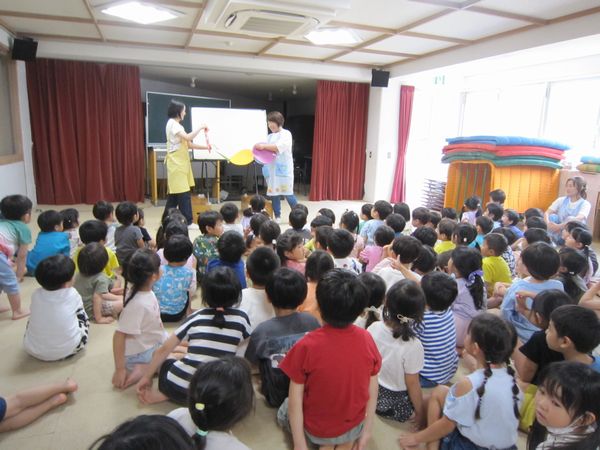 6月7月生まれのお友達の誕生会で、みんなで多目的ホールに集まりお祝いしました♫先生たちからも丸の形のシルエットクイズやへんしんトンネルの楽しいお話のプレゼントがありました!