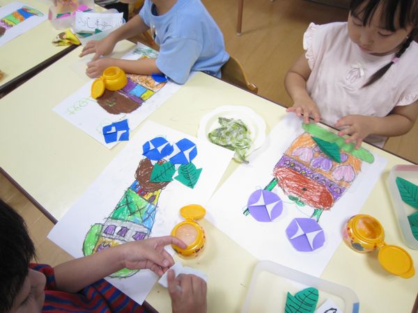 あさがおと葉っぱを折り紙で作り、画用紙に描いた植木鉢に貼り付けました★