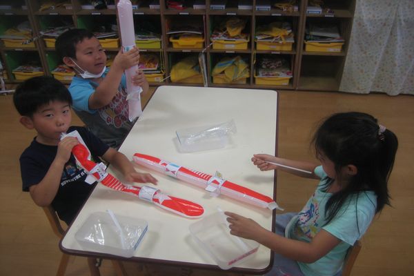 ロケットにストローをさして空気を入れ、はねと重りを付けたら、くるくるロケットの完成です☆