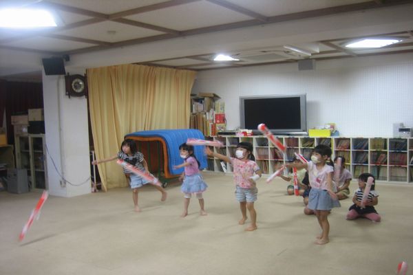 ホールや多目的ホールの広い場所に移動して、みんなでロケットをとばして遊びました♪