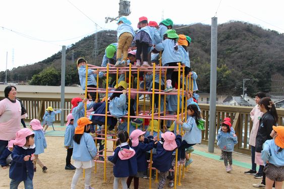 本年度の卒園記念品としてジャングルジムを選ばせていただきました。古くなった滑り台の代わりに新しく設置されたジャングルジム。安全な遊び方を伝え、さっそく遊びました。
