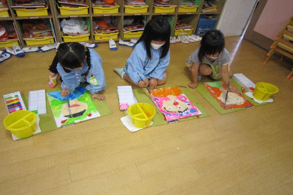 今日は父の日に向けて、お父さんの顔を描きました! 「私は優しいお父さんなの!」や「いつもかっこいいんだよ!」など お父さん自慢をしながら一生懸命取り組みました☆彡 絵の周りは絵の具で塗りました!