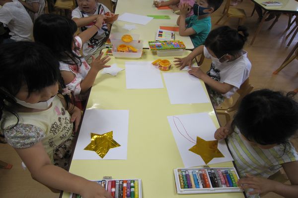 今日は、幼稚園に飾る七夕飾りを作りました。