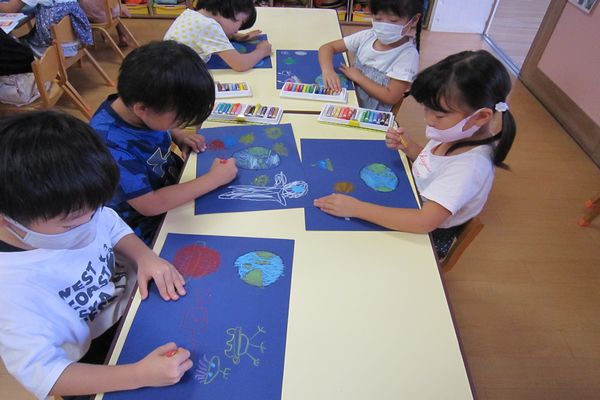 その後、宇宙人やUFO、地球など描いたりしました! 昨日折ったロケットを貼って完成させました☆彡