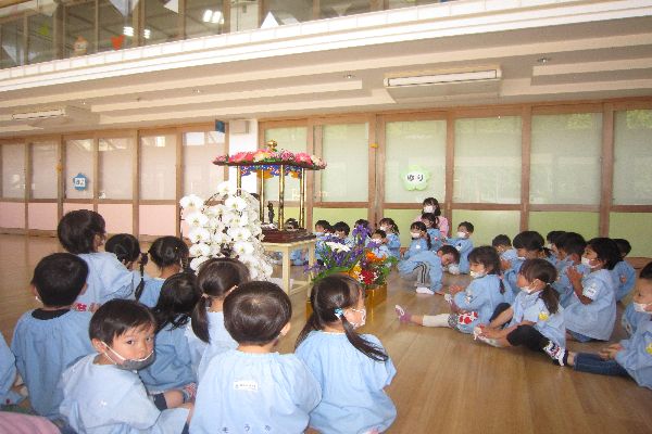 おしゃかさまをお迎えした後、1階のホールに集まって、花まつりのお祝いをしました。園長先生から、「みんなにもお誕生日があるね!おしゃかさまの誕生日は、ろうそくやケーキでお祝いするのではなく、甘い甘茶をかけてお祝いしようね!と、お話してもらいました。