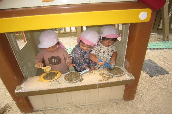 「いらっしゃいませ~!おいしいですよ~」ハウスが、お店屋さんになっていました♪総合遊具の「あみあみ」と、こどもたちが読んでいる所も、登れるようになりました。お友達同士「がんばってー」と、応援してあげていました。