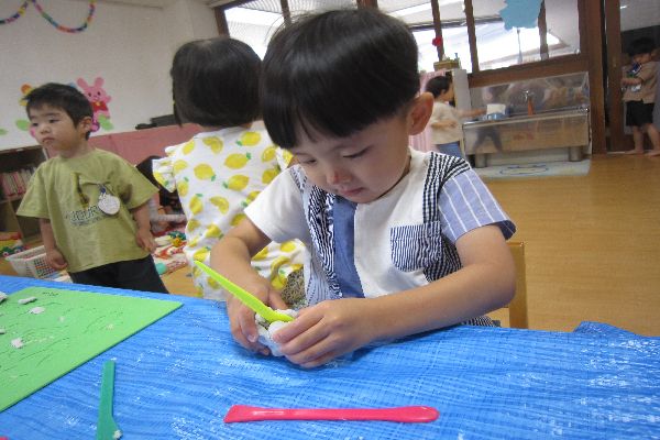 いちご組さんと一緒に遊びました。粘土・お絵描き・おもちゃとそれぞれ好きな遊びを楽しみました。おやつを食べた後は、ボールで遊んだり、園庭で滑り台や砂遊びをしました。