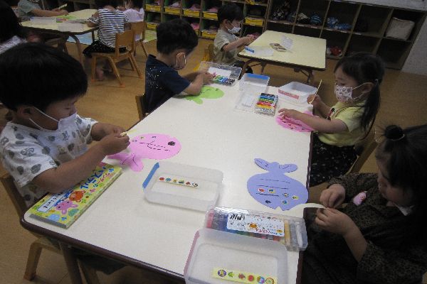 お話を見た後は、お部屋に帰って、みんなで天井に飾る魚を製作しました。自分の好きな色の魚を選んでみました。飾るのが楽しみです♪