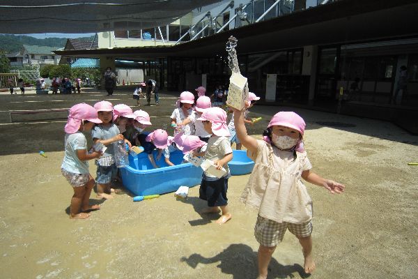 牛乳パックのコップを使って水遊びをしたり、水鉄砲も上手に使ってみんなとっても楽しく遊びました。