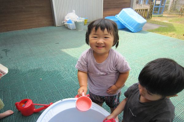 今日は、楽しみにしていた水遊びの日!着替えを持ってきたいちご組さん!早く水遊びをしたくてたまらない様子です♪水を入れたたらいや、おもちゃを見て、更にうきうきしたようです♪