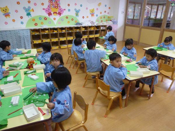 お道具箱の中になにがあるのかみんなでみてみました。お絵描きやのり、カスタネットなど少しずつ使っていきます。今日は、みんなで粘土あそびをしました。たのしかったね!
