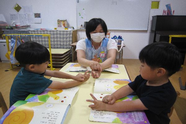 月刊絵本の6月号を見ました。自分の絵本を1ページずつめくりながら見ました。シールのページでは、ケーキにくだもののシールを貼って、おいしいケーキを完成させました。歌のページでは、かたつむりの歌だったので、手でかたつむりを作って歌いました。毎月読んでいきます。7月号はどんなお話か楽しみだね!