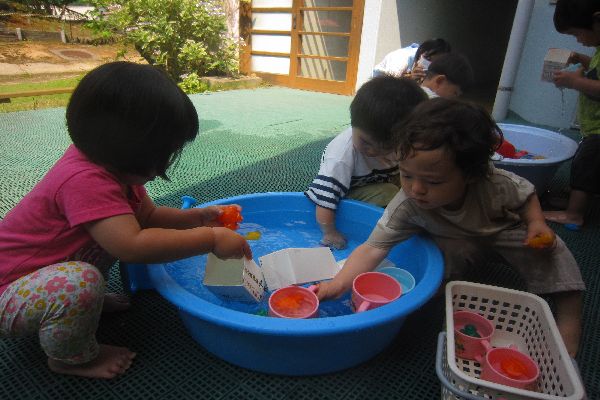 水遊びを楽しんだ後は、おいしいおやつ!いただきますのごあいさつも、上手になりました!