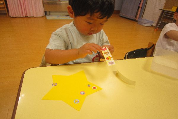 おやつを食べた後、七夕飾りを製作しました!星にペタペタシールをはってみました♪たのしかったね!